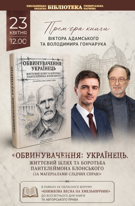 23 квітня о 12.00 відбудеться прем’єра книги Віктора Адамського та Володимира Гончарука «Обвинувачення: українець. Життєвий шлях та боротьба Пантелеймона Блонського» (за матеріалами слідчих справ).