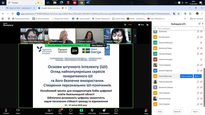 Значну увагу приділено опануванню сучасних інструментів штучного інтелекту, які можуть ефективно використовуватися у щоденній роботі бібліотек. Учасники ознайомилися з можливостями програм ШІ для створення текстів, підготовки інформаційних матеріалів, написання анонсів і повідомлень, генерації зображень, підготовки презентацій, пошуку та структурування інформації. Під час практичної частини координатори навчалися правильно формулювати запити до ШІ-сервісів, оцінювати якість отриманого результату.
