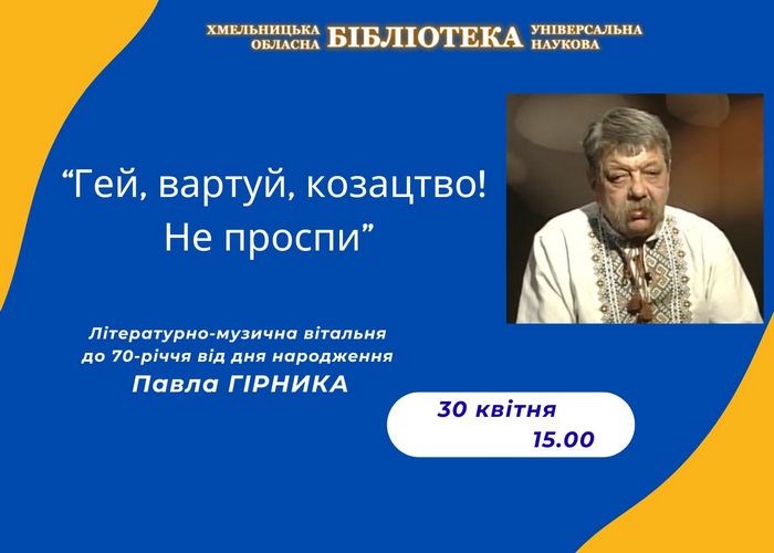 30 квітня о 15.00 відбудеться літературно-музична вітальня «Гей, вартуй, козацтво! Не проспи» до 70-річчя від дня народження Павла Миколайовича Гірника, поета, лауреата Національної премії України імені Тараса Шевченка, лідера Українського Народного Руху на Хмельниччині.