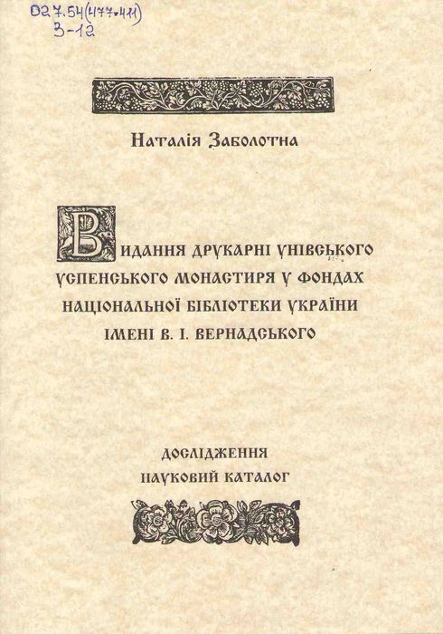 Б52659 027.54(477.411) З-12 Заболотна Н. Видання друкарні Унівського Успенського монастиря у фондах Національної бібліотеки України імені В. І. Вернадського: дослідж., наук. кат. / Н. Заболотна ; НАН України, Нац. б-ка України ім. В. І. Вернадського. – Київ : [б. в ], 2024. – 344 с. Дослідження присвячено спадщині визначного осередку вітчизняного друкарства XVII – XVIII ст., відомої святині – Успенського монастиря в Уневі, яка є важливою частиною українського історико-культурного надбання. Послідовно розглянуто основні віхи в історії монастиря та його друкарні, подано загальний огляд продукції Унівської друкарні, приділено увагу використанню української мови в унівських стародруках, описано оформлення та візуальні характеристики унівських видань, здійснено доповнення та уточнення бібліографії, висвітлено епізоди з побутування унівських стародруків. До науково-бібліографічної частини увійшли деталізовані описи унівських видань середини XVII – середини XVIII ст. із фондів Національної бібліотеки України імені В. І. Вернадського, та, відповідно, їх примірників. Зафіксовано провенієнції кожного примірника, відтворено маргінальні записи у книгах, описано зовнішній вигляд і матеріал оправ, охарактеризовано стан збереження стародруків. Поряд із відомими унівськими друками подано описи видань, не відображених у сучасній бібліографії. Праця доповнює відомості про історію Унівської друкарні та формування її видавничого асортименту, а також містить нову інформацію про побутування конкретних унівських стародруків протягом століть і в такий спосіб пропагує українську історико-культурну спадщину.