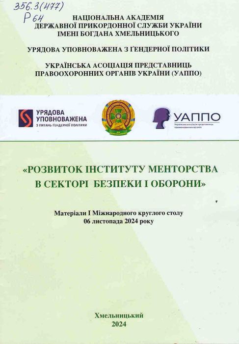 Розвиток інституту менторства в секторі безпеки та оборони : матеріали І Міжнар. круглого столу 06 листоп. 2024 р. / НАДПСУ ім. Б. Хмельницького, Урядова уповноважена з гендерної політики. – Хмельницький : [б. в.], 2024. – 48 с.