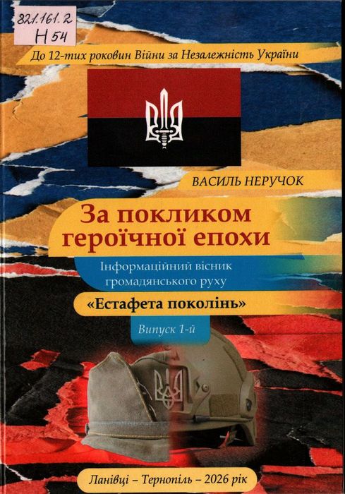 А48042-1 821.161.2 Н54 Неручок, В. П. За покликом героїчної епохи : інформ. вісн. громад. руху «Естафета поколінь». Вип. 1 / В. П. Неручок. – Тернопіль ; Ланівці : Осадца Ю.В., 2026. – 294 с. : фот. У пропонованих публікаціях періоду 2002–2026 років загострено увагу на вадах української демократії, що зумовлені не лише авантюрним, антиконституційним законодавством, але й недорозвиненістю громадянського суспільства. Аналізуючи загрозливі суспільні недуги, автор та упорядник видання популяризує державотворчі ідеї великих українців: Симона Петлюри, Степана Бандери, Володимира Винниченка; у якості аргументів наводить висновки із наукового альманаху «Кроки до громадянського суспільства» (2004), долучає фрагменти щоденникових нотаток Олександра Мороза «Записки під час війни», осмислює актуальні дослідження доцента кафедри філософії та культурології Чернігівського колегіуму ім. Т. Г. Шевченка Миколи Богуна, акцентує увагу на експертних оцінках доктора юридичних наук Олексія Ющика. Мистецьку канву збірника формують твори визнаних майстрів красного письменства: Павла Глазового, Олександра Стовби, Олександра Мороза, Андрія Кузьменка, Віталія Іващенка, Ігоря Павлюка.