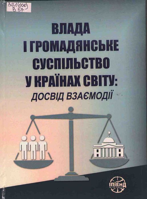 А47938 321(100) В57 Влада і громадянське суспільство у країнах світу : досвід взаємодії : монографія / НАН України, Ін-т політ. і етнонац. дослідж. ім. І. Ф. Кураса ; за ред. О. М. Майбороди. – Київ : ІПіЕНД ім. І. Ф. Кураса НАН України, 2025. – 472 с. Книга містить аналіз прикладів взаємодії органів державної влади і організацій громадянського суспільства в різних регіонах світу – у країнах пострадянського простору, Центрально-Східної і Західної Європи, Південно-Східної Азії, Африканського континенту. Розкрито взаємозв’язок між характером політичного режиму і характером його відносин з громадянським суспільством, простежено зростання впливу громадських організацій на політичне правління та на розв’язання актуальних суспільних проблем. Зміст книги ілюструє здатність громадянського суспільства в демократичних умовах бути одним із впливових акторів суспільного життя і помітним фактором впливу на політичний розвиток.