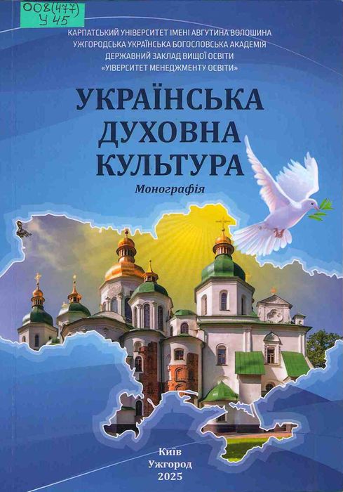 А47934 008(477) У45 Українська духовна культура : монографія / Карпат. ун-т ім. Августина Волошина ; за наук. ред. В. Бедь. – Київ ; Ужгород : Юстон, 2025. – 338 с. Видання є спільним науковим проєктом провідних учених, освітян, науково-педагогічних працівників закладів освіти України, які займаються питаннями духовної культури України. У монографічному дослідженні висвітлюються тенденції, стан і перспективи розвитку духовної культури України, окреслені сучасні зміст, форми і методи розвитку духовної культури підростаючого покоління, проаналізовано проблеми і перспективи впровадження програми духовної культури в закладах освіти, систематизовано організаційні тенденції підготовки педагогічних і науково-педагогічних кадрів для підвищення їх духовної культури і здоров’я.