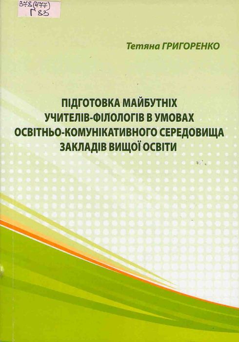 А47946 378(477) Г83 Григоренко Т. Підготовка майбутніх учителів-філологів в умовах освітньо-комунікативного середовища закладів вищої освіти : монографія / Т. Григоренко ; за наук. ред. В. О. Коваль ; Уманськ. держ. пед. ун-т ім. П. Тичини. – Хмельницький : Бідюк Є. І., 2020. – 360 с. Висвітлено результати дослідження методологічних, теоретичних, дидактичних та методичних засад підготовки майбутніх учителів-філологів в умовах освітньо-комунікативного середовища закладів вищої освіти. На основі авторської концепції розроблена система підготовки майбутніх учителів-філологів в умовах освітньо-комунікативного середовища закладів вищої освіти, обґрунтовані педагогічні умови підготовки та перевірено їх ефективність.