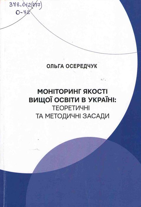 Б52696 378.012(477) О-72 Осередчук О. Моніторинг якості вищої освіти в Україні: теоретичні та методичні засади: монографія / О. Осередчук ; М-во освіти і науки України, Львів. нац. ун-т ім. Івана Франка. – Львів : ЛНУ ім. Івана Франка, 2023. – 312 с. Монографію присвячено теоретичним і методичним засадам моніторингу якості вищої освіти в Укpaїні. Науковий дискурс проблеми моніторингу якості вищої освіти в Україні вибудуваний за трьома напрямами: праці дисертаційного характеру, монографії й навчальні посібники, наукові періодичні видання. У дослідженні схарактеризовано історичні передумови розвитку моніторингу якості освіти; витлумачено основні засади моніторингу якості освіти в різних країнах світу; окреслено методологічні підходи до вивчення моніторингу якості освіти; з’ясовано функції та принципи моніторингу якості вищої освіти, що описані вченими; виокремлено основні з них, які сприяють ефективності моніторингу якості вищої освіти; репрезентовано групи методів моніторингу, що найбільш продуктивно використовують для діагностування якості освіти. Диференційовано чотири педагогічні умови для проведення якісного моніторингу якості вищої освіти, що мають забезпечити досягнення поставленої мети; розглянуто взаємодію компонентів освітньої системи; проаналізовано функціювання розробленої моделі моніторингу якості вищої освіти в Україні, яка має сприяти вдосконаленню освітнього процесу в закладах вищої освіти. Результатами й висновками дослідження, представленими в монографії, доцільно послуговуватися для обґрунтування концепцій, нормативних документів, подальшого розвитку стратегій моніторингу якості вищої освіти в Україні.