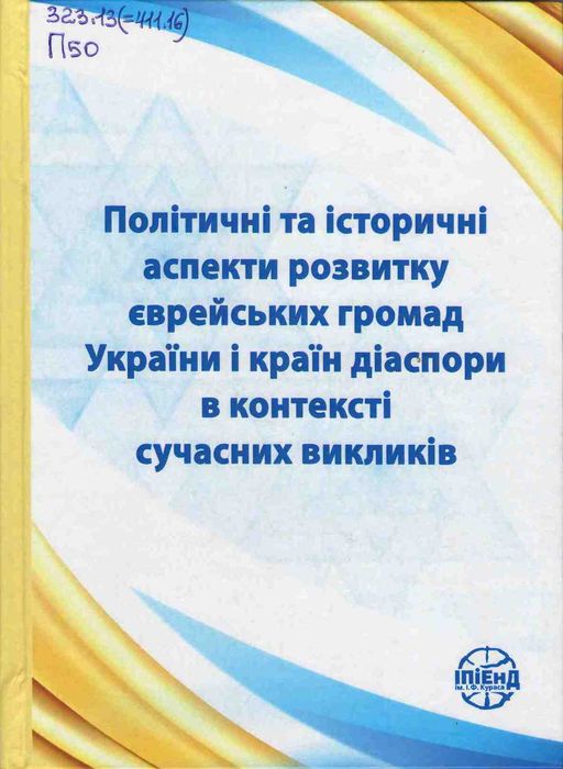А47942 323.13(=411.16) П50 Політичні та історичні аспекти розвитку єврейських громад України і країн діаспори в контексті сучасних викликів : монографія / НАН України, Ін-т політ. і етнонац. дослідж. ім. І. Ф. Кураса ; кер. авт. кол. А. Ю. Подольський. – Київ : ІПіЕНД ім. І. Ф. Кураса, 2024. – 360 с. Пропонована наукова праця містить аналіз нинішньої політичної та соціально-культурної ситуації єврейської спільноти України під час російської агресії та війни проти України. В рамках зазначеної науково-дослідної теми було насамперед приділено увагу вивченню різних аспектів сучасного стану єврейської громади України, особливо ставлення цієї спільноти до російської агресії та участь українських євреїв у протистоянні країні-агресорці. Ці напрями досліджень зазначені, проаналізовані та розкриті в тексті монографії. Дослідження проводилося співробітниками Центру єврейської історії та культури Інституту політичних і етнонаціональних досліджень ім. І. Ф. Кураса НАН України та було підтримано вченими з інших наукових установ. Монографія підготовлена за результатами виконання науково-дослідної роботи «Політичні та історичні аспекти розвитку єврейських громад України і країн діаспори в контексті сучасних викликів». Видання містить краєзнавчий матеріал.