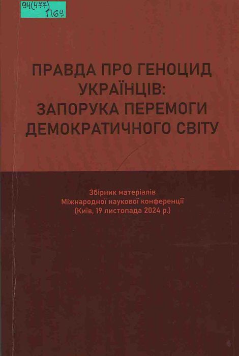 Б52694 94(477) П69 Правда про геноцид українців : запорука перемоги демократичного світу: зб. матеріалів Міжнар. наук. конф. (Київ, 19 листоп. 2024 р.) / Укр. держ. ун-т ім. М. Драгоманова, Нац. асоц. дослід. Голодомору-геноциду українців ; упоряд.: П. М. Чернега, О. О. Стасюк, М. Г. Кочерга. – Київ ; Харків : Право, 2025. – 446 с. Науковий збірник містить виступи, статті, доповіді, які розкривають найтяжчий злочин, учинений комуністичним тоталітарним режимом проти української нації в 1932 – 1933 рр. Також до збірника додано міжнародну комплексну судову історико-правову експертизу, проведену Службою безпеки України під час досудового розслідування в кримінальному провадженні № 22019000000000309 щодо очільників партійних і каральних органів – виконавців злочину геноциду. Видання містить краєзнавчий матеріал.