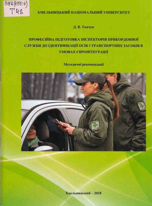 А47943 378(477:4) Т48 Ткачук Д. В. Професійна підготовка інспекторів прикордонної служби до ідентифікації осіб і транспортних засобів в умовах євроінтеграції: метод. рек. / Д. В. Ткачук ; ХНУ. – Хмельницький : Термінова поліграфія, 2018. – 75 с. Методичні рекомендації побудовано на основі аналізу вітчизняної психолого-педагогічної літератури, зарубіжного досвіду підготовки фахівців прикордонних служб, а також узагальнення інноваційних рішень щодо професійної підготовки інспекторів прикордонної служби до ідентифікації осіб і транспортних засобів з урахуванням вимог євроінтеграційних процесів.