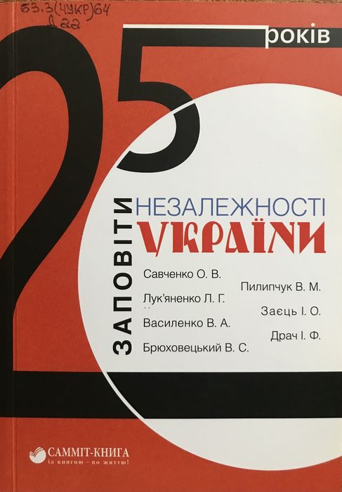 А43587 63.3(4УКР)64 Д22 25 років: Заповіти незалежності України / О. В. Савченко, Л. Г. Лук`яненко, І. Ф. Драч. - Київ : Самміт-книга, 2017. - 160 с. Книгу присвячено пошукам відповіді на ключові питання новітньої історії України. Автори глибоко аналізують складові успіху українців в їх боротьбі за незалежність. Саме незалежність України, на думку всіх авторів, яка була здобута українцями у 1991 році, стала причиною розпаду СРСР. Книга також дає відповідь на питання чому самостійна країна з такими ресурсами за 25 років незалежності не стала успішною. Всі автори книги приймали активну участь у боротьбі за незалежність, а тому, їх роздуми зацікавлять як істориків, так і будуть корисними для нової політичної еліти країни.