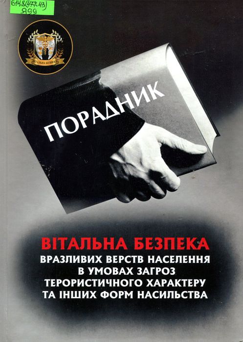 Б52608 614.8(477.43) Я99 Ящук П. В. Вітальна безпека вразливих верств населення в умовах загроз терористичного характеру та інших форм насильства : практ. порадник / П. В. Ящук ; Громад. орг. «Асоц. лікарів Хмельниччини», Науково-практ. центр «Вітальна безпека». – Вінниця : Твори, 2025. – 104 с. : фот. Видання має інтегрований міжгалузевий характер, орієнтоване на реалізацію принципів вітальної безпеки, захист життя, здоров’я та психоемоційної стійкості вразливих груп населення в умовах надзвичайних ситуацій, зокрема, терористичного характеру, а також у контексті загроз, зумовлених іншими формами насильства в кризових обставинах.