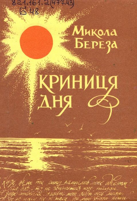 А47805 821.161.2(477.43) Б48 Береза М. П. Криниця дня : поезії / М. П. Береза. – Рівне : Ред.-вид. від. обл. упр. по пресі, 1992. – 16 с. У книжці вміщені вірші, в котрих відображено світ ліричного героя, де на першому місці – духовні пошуки. У багатьох поезіях порушуються проблеми національного відродження, екології, збереження вікових народних традицій.