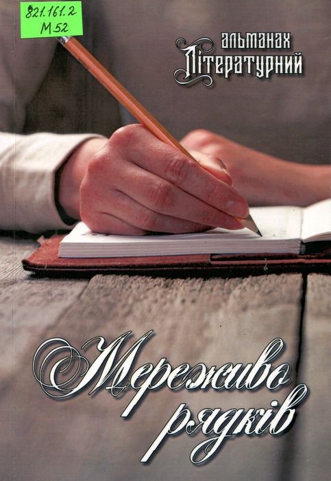 П1305-1 821.161.2 М52 Мереживо рядків : літ. альм. Ч. 1. – Хмельницький : Стасюк Л. С., 2024. – 200 с. У виданні вміщена поезія Ольги Вершинської з м. Хмельницький. Ч. 5. – Хмельницький : Стасюк Л. С., 2024. – 200 с. У виданні вміщена поезія Володимира Златова з м. Кам’янець-Подільський. Ч. 7. – Хмельницький : Стасюк Л. С., 2024. – 200 с. У виданні вміщена поезія Яніни Франкової із смт Нова Ушиця. Ч. 8. – Хмельницький : Стасюк Л. С., 2024. – 200 с. У виданні вміщена поезія Валентини Петряєвої з м. Кам’янець-Подільський, ВПО з Донеччини.