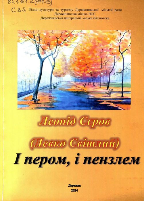 А47750 821.161.2(477.43) С32 Сєров Л. В. (Левко Світлий). І пером, і пензлем : літ.-худож. вид. / Л. В. Сєров ; упоряд. О. Ковпак ; Від. культури та туризму Деражнян. міськради, Деражнян. міська ЦБС. – Деражня : [б. в.], 2024. – 158 с. : фот. кольор. У виданні презентовано творчий доробок автора – поета і художника – з Деражнянщини, де вміщені його віршовані твори, картини, портрети відомих особистостей в Україні та світлини.