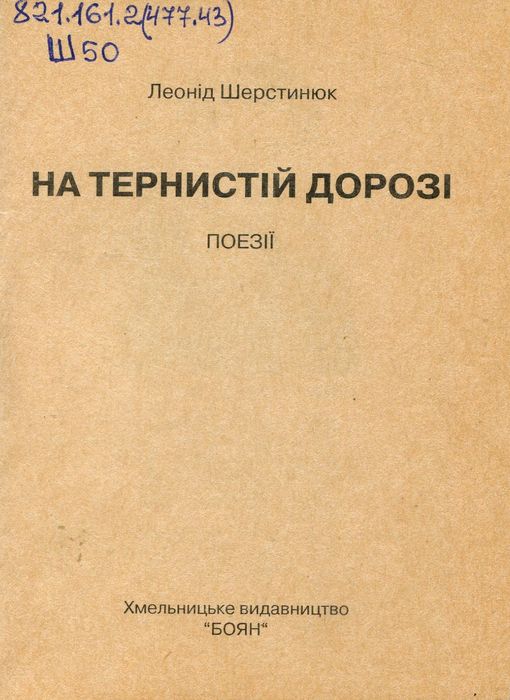 А47749 821.161.2(477.43) Ш50 Шерстинюк Л. І. На тернистій дорозі : поезії / Л. І. Шерстинюк. – Хмельницький : Боян, 2004. – 48 с. У другій книжці автора вміщені вірші, в яких описані краса природи, життя людей, емоції та почуття, які виникають у вирі подій.