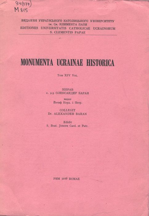 94(477) M 815 Baran A. Monumenta Ucrainae Historica: Vol. XIV – Romae, 1977. – 135 p. Як було передбачено вже на самому початку, збірка не закінчує видання «Монументів», але вони продовжуються оприлюдненням нових архівних матеріалів з історії України і Христової Церкви в Україні. За XIII томом, що приніс документи про нашу Церкву в Закарпатті, слідує XIV том, який містить акти про український патріархат у XIX ст. Вони підтверджують сучасний динамічний наш патріархальний рух. Деякі з них вже надруковано, більшість з’являється вперше. У цьому томі вони зібрані надзвичайним професором отцем Олександром Бараном. У статтях викладено матеріали про приналежність Помісної Української Церкви до патріархату.