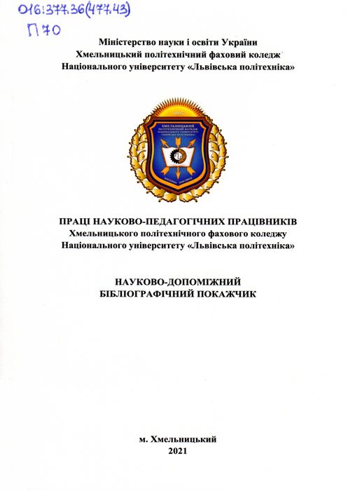 Б52551 П70 Праці науково-педагогічних працівників Хмельницького політехнічного коледжу Національного університету «Львівська політехніка» : наук.-допом. бібліогр. покажч. / ред. Л. М. Багас ; уклад. І. А. Квятковська. - Хмельницький : [б. в.], 2021. - 62 с. Праці науково-педагогічних працівників Хмельницького політехнічного коледжу Національного університету «Львівська політехніка». Бібліографічний покажчик науково-методичних праць носить інформативний характер і знайомить користувачів з виданнями науково-педагогічних працівників, що надійшли у фонд бібліотеки та документами в електронному вигляді. Покажчик розраховано на науковців, викладачів, фахівців та здобувачів передвищої фахової освіти.