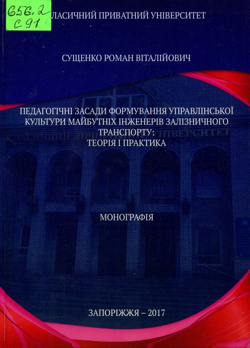 Б52673 656.2 С91 Сущенко Р. В. Педагогічні засади формування управлінської культури майбутніх інженерів залізничного транспорту: теорія і практика : монографія / Р. В. Сущенко ; Класич. приват. ун-т. – Запоріжжя : [б. в.], 2017. – 448 с. Сучасне розуміння смисло-ціннісного ідеалу майбутнього інженера залізничного транспорту як висококультурної, конкурентоздатної особистості орієнтує професійну підготовку залізничних ВНЗ на інтегрування, осягнення і визнання викладачами і студентами управлінської культури інженера складовою професіоналізму. Чільне місце відводиться проблемам «педагогізації» професійної підготовки майбутніх інженерів в умовах непедагогічних ВНЗ. Адресовано викладачам вищих навчальних закладів, докторантам, аспірантам, магістрантам і студентам.