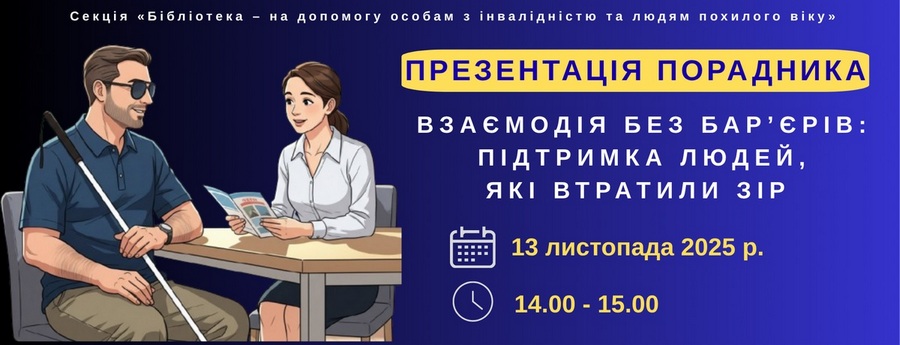 Українська бібліотечна асоціація запрошує на презентацію порадника «Взаємодія без бар’єрів: підтримка людей, які втратили зір», що відбудеться 13 листопада 2025 року о 14:00 онлайн на платформі ZOOM. Захід організовано Секцією Української бібліотечної асоціації «Бібліотека – на допомогу особам з інвалідністю та людям похилого віку» в межах відзначення Міжнародного дня незрячих.