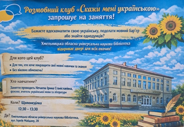 Відділ абонемента запрошує щопонеділка на 12:30 долучитися до розмовного клубу «Скажи мені українською»! Це ідеальне місце, щоб позбутися мовного бар’єру, знайти однодумців та вдосконалити свої навички.
