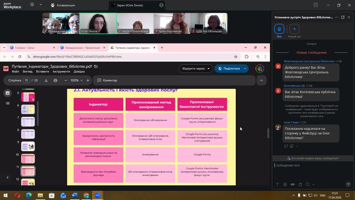 Працівники відділу доєдналися до вирішення нагальних питань щодо подальшої роботи в даному напрямку. Учасники цікавились інтерактивним опитуванням; висловили потребу отримання додаткових знань щодо використання медично-спортивного обладнання. Модератори надали детальні інструкції стосовно оновлення Щоденника здорових бібліотек, познайомили з Путівником по індикаторам Здорових бібліотек, який допоможе зручно та швидко відстежувати результати роботи.