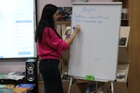 «Німецька мова для початківців» з волонтеркою Софією Волошиною: закріпили вживання часток nicht і doch у відповідь на заперечні запитання, повторили відмінювання іменників та артиклів чоловічого роду в Akkusativ, навчались розповідати про себе, виконуючи підстановчі вправи з анкетами, розпочали вивчення минулого часу (Perfekt), зокрема, різницю у вживанні допоміжних дієслів haben та sein.