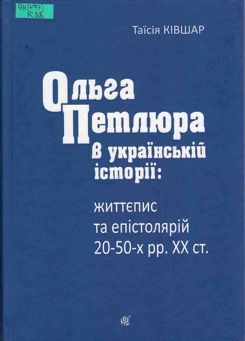 Б52627 94(477) К38 Ківшар Т. І. Ольга Петлюра в українській історії: життєпис та епістолярій 20–50-х рр. ХХ ст. / Т. І. Ківшар. – Тернопіль : Богдан, 2025. – 792 с. : фот. – (Державна програма – 2025). У книжці вперше на новій джерельній базі висвітлюється життєпис Ольги Петлюри, педагогині, громадської діячки, аристократки, колишньої Першої леді Української Народної Республіки, дружини і вдови визначного державного, військового й громадського діяча Симона Петлюри. Розкривається її роль в українському суспільно-політичному, громадському та жіночому русі УНРівської доби. Підготовлений і представлений епістолярій О. Петлюри з коментарями дає уявлення про взаємини між провідними українськими політиками та вченими, а також громадсько-політичне, родинно-побутове, культурне та інтелектуальне життя української політичної еміграції в Західній Європі першої половини ХХ ст.