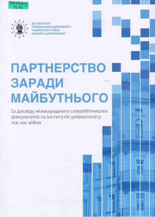 В6695 378.4(477:4) П18 Партнерство заради майбутнього Із досвіду міжнародного співробітництва факультетів та інститутів університету під час війни : до 190-річчя Укр. держ. ун-ту ім. М. Драгоманова / авт. кол. : В. Андрущенко (кер.), В. Лавриненко (упоряд.). – Київ : Людмила, 2025. – 182 с. : фот. Дане видання – звіт факультетів та інститутів з важливого напрямку діяльності університету – міжнародного співробітництва. Це звіт за останні три роки періоду війни.