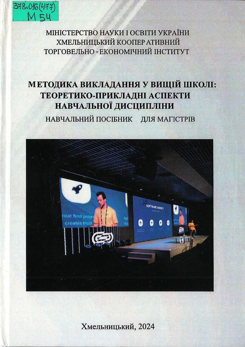 А47766 378.016(477) М54 Методика викладання у вищій школі : теоретико-прикладні аспекти навчальної дисципліни : навч. посіб. для магістрів / С. В. Маркова, В. Д. Коцюк, Д. В. Костенко ; М-во освіти і науки України, Хмельниц. кооп. торговельно-екон. ін-т. – Хмельницький : Монускрипт, 2024. – 144 с. У навчальному посібнику для магістрів «Методика викладання у вищій школі: теоретико-прикладні аспекти навчальної дисципліни» представлено досвід навчально-методичної роботи викладачів ЗВО; викладено основи навчального курсу для магістрів (зокрема економічних спеціальностей), запропоновано нові теми на стикові дисциплін та субдисциплін (як-от філософії, історії України, загальної психології, соціальної педагогіки), що актуалізовані під час російсько-української війни; прикладні навчальні матеріали, що забезпечать свідоме засвоєння, сприятимуть рефлексії, критичному мисленню тощо.