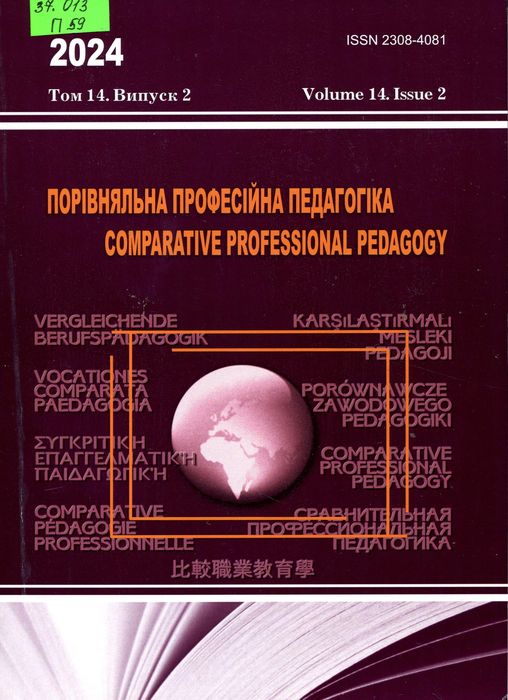 П1138-14(2)2024 37.013 П59 Порівняльна професійна педагогіка : наук. журн., англо-укр. вид. Т. 14. Вип. 2 (2024) / Нац. акад. пед. наук України, Ін-т пед. освіти і освіти дорослих, Хмельниц. нац. ун-т, Центр порівняльн. проф. педагогіки ; гол. наук. ради В. Г. Кремень ; гол. ред. Н. М. Бідюк. – Київ ; Хмельницький : ХНУ, 2024. – 234 с. – англ. та укр. мовами. Проблематика дослідження включає: теоретико-методологічні засади педагогічної компаративістики; сучасні стратегії та тенденції розвитку освіти у світовому просторі; розвиток освітніх систем у зарубіжному досвіді; порівняльний аналіз освітнього процесу у вітчизняних та зарубіжних закладах освіти різних рівнів акредитації; теорію і практику організації навчально-пізнавальної, дослідницької, самостійної діяльності в різних закладах освіти у зарубіжній практиці; пошук ефективних шляхів наукового вивчення і коригування сучасних процесів, що відбуваються в світовій педагогіці й освітній політиці; вивчення та узагальнення позитивного досвіду зарубіжних країн у сфері виховання; методичні аспекти іншомовної підготовки у системі освіти провідних країн світу.