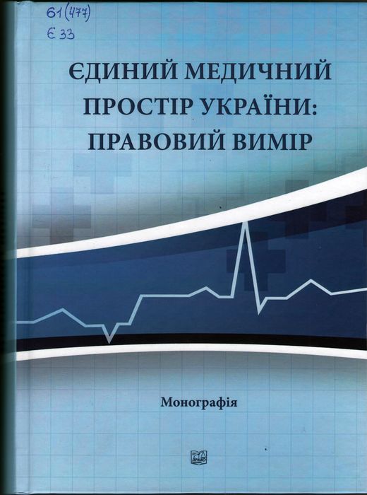 Б52597 61(477) Є33 Єдиний медичний простір України : правовий вимір : монографія / за заг. ред. С. Г. Стеценка. – Харків : Право, 2022. – 672 с. У монографії розглянуто актуальні проблеми створення та функціонування в Україні єдиного медичного простору. Зосереджено увагу на питаннях сутності, ознак, характеристик єдиного медичного простору, його базових принципах. Акцентовано на особливостях функціонування державних, комунальних, відомчих і приватних медичних закладів в умовах медичної реформи Проаналізовано нормативно-правове забезпечення формування єдиного медичного простору України та позитивний зарубіжний досвід реалізації такого роду проєктів. Представлена колективна праця стала логічним продовженням низки наукових заходів медико-правового спрямування, організованих Центром медико-правових досліджень НАПрН України та НАМН України, зокрема науково-практичної конференції «Єдиний медичний простір України: правові засади інтеграції потенціалів державної та приватної медицини», яку 15 травня 2019 р. було проведено в Києві на базі клініки «Аксімед».