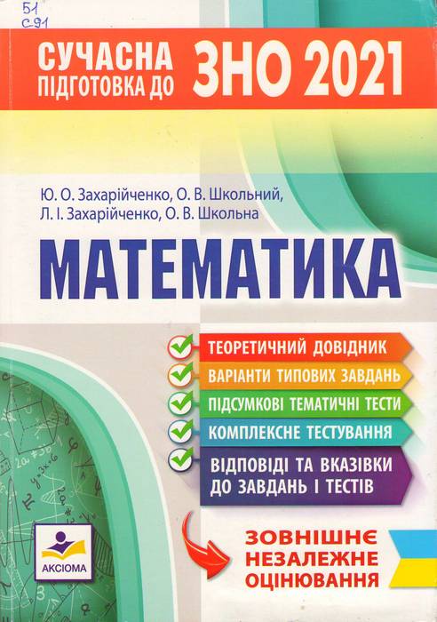 В6072 51 С91 Сучасна підготовка до ЗНО з математики : посібник / авт. кол. Ю. О. Захарійченко [та ін.] – Кам`янець-Подільський : Аксіома, 2020. – 232 с. Посібник призначений для підготовки до ЗНО з математики і містить усі необхідні для цього теоретичні відомості та тренувальні завдання різних рівнів складності. Весь матеріал розбитий на 10 розділів у відповідності до основних змістових ліній шкільного курсу математики. Тренувальні завдання подано за зростанням рівня складності і парами: завдання а) учень виконує разом з учителем, а завдання б) – самостійно. До кожного розділу подано тематичний тест, а наприкінці посібника наведено комбіновані тести у форматі ЗНО 2021 року. До всіх тренувальних завдань і завдань тестів подано відповіді, а для найбільш складних завдань – ще й вказівки для їх розв’язування.