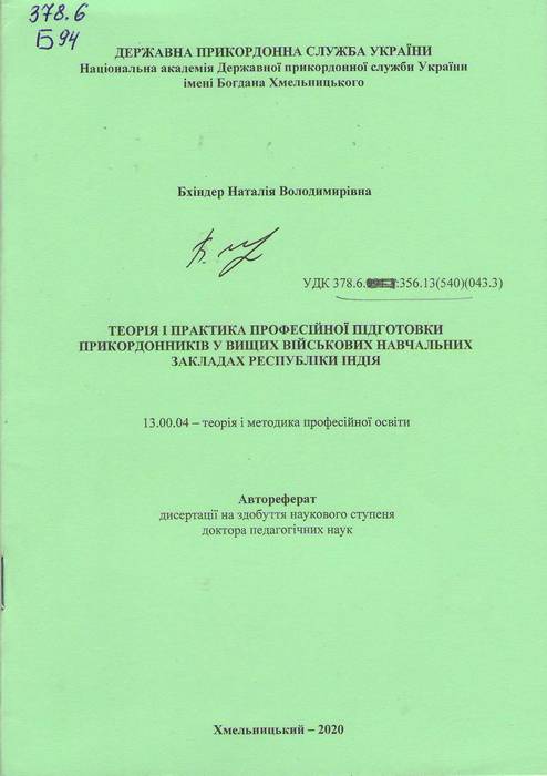 А44717 378.6 Б94 Бхіндер Н. В. Теорія і практика професійної підготовки прикордонників у вищих військових навчальних закладах Республіки Індія : 13.00.04 – теорія і методика професійної освіти : автореф. дис. на здобуття наук. ступеня док. пед. наук / Держ. прикордонна служба України, Нац. акад. ДПС України ім. Б. Хмельницького. – Хмельницький : Нац. Акад. ДПС України, 2020. – 40 с. У дослідженні охарактеризовано систему професійної підготовки прикордонників у вищих військових навчальних закладах Республіки Індія з урахуванням її властивостей та параметрів, визначено її компоненти. Подано генезис і періодизацію становлення та розвитку професійної підготовки прикордонників у Республіці Індія. Проаналізовано особливості змісту професійної компетентності прикордонників Республіки Індія та здійснено класифікацію професійно-особистісних вимог, що висуваються умовами служби. Здійснено аналіз змістових та технологічних особливостей професійної підготовки індійських прикордонників, досліджено інноваційні педагогічні технології, які впроваджено в освітній процес вищих військових навчальних закладів Республіки Індія.