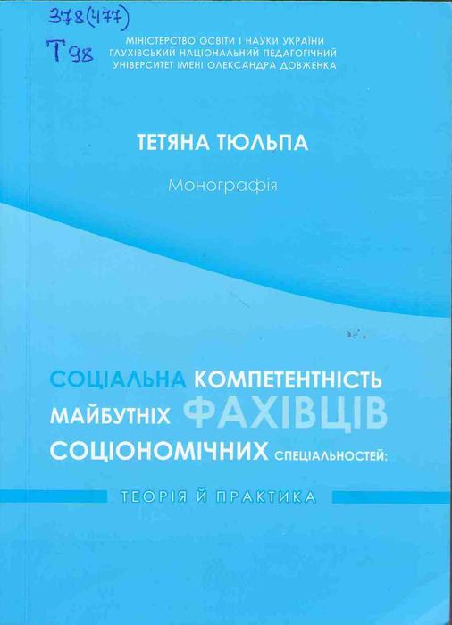 А47944 378(477) Т98 Тюльпа Т. Соціальна компетентність майбутніх фахівців соціономічних спеціальностей: теорія й практика: монографія / Т. Тюльпа ; М-во освіти і науки України, Глухів. нац. пед. ун-т ім. О. Довженка. – Черкаси : Чабаненко Ю. А., 2020. – 443 с. Монографію присвячено актуальним питанням реалізації положень компетентного підходу в організації освітнього процесу у вищій школі в аспекті формування соціальної компетентності майбутніх фахівців соціономічних спеціальностей. Показано важливість розвитку соціальної компетентності саме для студентів – майбутніх педагогів, соціальних педагогів, соціальних працівників з урахуванням специфіки їхньої фахової підготовки. Проаналізовані становлення, розвиток і сучасний стан проблеми формування соціальної компетентності у професійній підготовці. Розроблено модель, що відображає авторську систему формування соціальної компетентності майбутніх фахівців соціономічних спеціальностей; запропоновано й апробовано технологічну стратегію, розроблено, обгрунтовано й показано оптимальні способи імплементації її в освітній процес вищої школи.