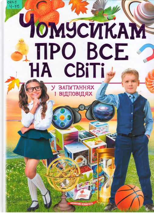 В6517 087.5 Ч-75 Чомусикам про все на світі у запитаннях і відповідях / Ю. Кулікова, Ю. Данчук. – Харків : Пегас, 2019. – 256 с. : іл. кольор. – (Подарункова енциклопедія). Універсальна енциклопедія, яку можна порівняти з великим кораблем Знань, що вирушає досліджувати острови Наук. Подорожуючи разом із книгою, ти дізнаєшся про відоме і маловідоме, просте і складне, про Всесвіт, зірки і планети, про скарби в надрах Землі, дивовижний світ тварин і рослин, про різні винаходи, дивні відкриття і людей, які їх здійснили, і багато-багато іншого.