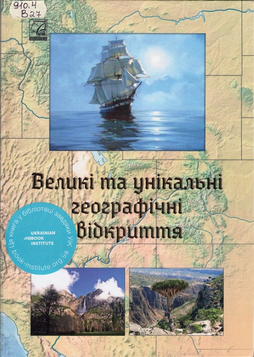Б51280 910.4 В 27 Великі та унікальні географічні відкриття / уклад. М. В. Зінкевич. – Тернопіль : Астон, 2020. – 232 с. : іл. – (Державна програма – 2020). У даній книзі вміщено відомості про унікальні географічні об`єкти і процеси та розповіді про визначні географічні відкриття. В ній йдеться про географію як науку, результати досліджень, досягнення, відкриття, проблеми, гіпотези і напрямки майбутніх географічних досліджень.