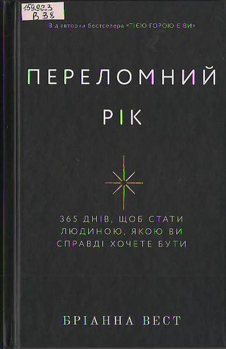 А47503 159.923 В38 Вест Б. Переломний рік. 365 днів, щоб стати людиною, якою ви справді хочете бути / Б. Вест ; пер. з англ. Л. Присяжнюк. – Київ : Букшеф, 2025. – 384 с. Ця книга із короткими розмірковуваннями на щодень стане корисним супутником для тих, хто потребує додаткової мотивації. Вона може допомогти вам завершити проєкт або отримати нову роботу, змінити ставлення до проблем і тривог або знаходити плюси навіть у найнеймовірніших ситуаціях, почати сприймати себе такими, якими ви є, або змінитися й стати тими, ким ви завжди хотіли бути. Колекція повсякденних медитацій від авторки бестселерів «101 есей, який змінить ваше мислення» та «Тією горою є ви» дасть вам змогу збагнути, як отримати від себе більше, ніж ви, можливо, сподівалися. Присвятіть наступні дванадцять місяців свого життя, щоб принести в нього виважені й реальні зміни, які починаються з вашого мислення.