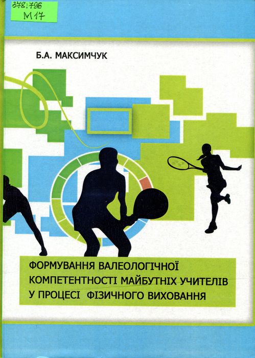 Б52693 378:796 М17 Максимчук, Борис Анатолійович. Формування валеологічної компетентності майбутніх учителів у процесі фізичного виховання : монографія / Б. А. Максимчук ; Вінниц. держ. пед. ун-т ім. М. Коцюбинського. - Вінниця : Планер, 2016. - 388 с. У монографії досліджено особливості формування валеологічної компетентності майбутніх учителів у процесі фізичного виховання як соціально-педагогічної проблеми. Розроблено педагогічну модель формування валеологічної компетентності майбутніх учителів, визначено компоненти, критерії, рівні та показники їх сформованості. На основі аналізу теоретичних підходів до формування валеологічної компетентності обгрунтовано організаційно-методичні умови та розроблено методику її формування у майбутніх учителів у процесі фізичного виховання.