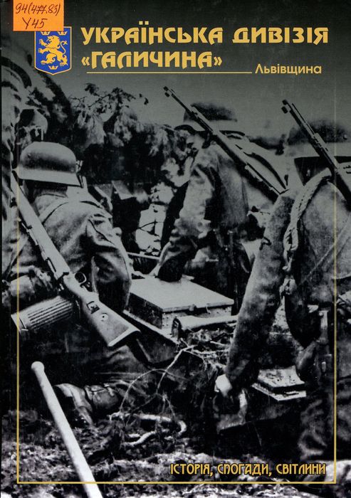 Б52707 94(477.83) У45 Українська дивізія «Галичина» (Львівщина)): історія, спогади, світлини : / Галиц. Братство колиш. вояків 1-ої Укр. дивізії ("Галичина") Укр. нац. армії (УНА), Центр незалежних іст. студій ; упоряд. І. В. Іваньков, М. В. Романюк, ред. З. Врублевський [та ін.]. - Львів : Духовна вісь, 2016. - 841 с. Книга присвячена маловідомій історії формування та бойового шляху дивізії «Галичина», -українського військового підрозділу у складі німецької армії періоду Другої світової війни та організаційної діяльності його комбатантських об’єднань у повоєнний час. Видання багате унікальними фотографіям, історичними документами періоду функціонування дивізії, а також світлинами з організаційної діяльності Львівської станиці Галицького Братства колишніх вояків 1-ої УД «Галичина» УНА у 1992-2016 рр.