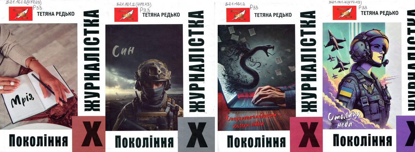 П1303-1 821.161.2(477.43) Р33 Редько Т. Журналістка покоління Х / Т. Редько. – Житомир : Бук- Друк, 2025 – Кн. 1 : Мрія : роман-сага. – 2025. – 508 с. У виданні авторки із …. розповідається про українку Таню Квасневську, народжену в СРСР, яка дізнається, що вона – онука Генсека Латвії, який відмовився від її матері. Навчаючись в університеті, головна героїня отримує наказ стати військовою розвідницею під прикриттям професії журналіста. Таня проходить навчання ще і у засекреченому вузі ГРУ. Її готують як агента для закордонного відрядження. Згодом вона стає засновницею першої в Україні незалежної медіакорпорації і працює в ній редактором. Та одне відрядження перевертає долю журналістки – в Таню закохується принц Катару, якого зустріла в далекій Сахарі. Кн. 2 : Син : роман-сага. – 2025. – 440 с. У виданні розповідається про сина Тані, який обере шлях офіцера спецвійськ України, але буде навчатися в академії СБУ в епоху зрадників. Журналістці, разом із сином-курсантом, доведеться пережити нерівне протистояння із системою, оповитою мережею ворожої агентури. Але їх підтримуватимуть офіцери – патріоти України. Кн. 3 : Спецпропагандисти-кілери : роман-сага. – 2025. – 364 с. У книзі вперше розкриваються таємниці підготовки особливих розвідників – спецпропагандистів рф. Їх ГРУ та ФСБ уводить «кротами» у публічні професії – від журналістів, дипломатів, культурних діячів до священників – для зомбування мас людиноненависницькою ідеологією – рашизмом. Цій таємній армії протистоїть українська журналістка Таня Квасневська, яка вибрала правду, та її син – розвідник. Кн. 4 : Столиця Неба : роман-сага. – 2025. – 308 с. У виданні авторка продовжує описувати події загарбницької війни рф, приділяє увагу племінниці Тані Квасневської – Каті, яка стає військовою льотчицею. Вона закінчує Харківський військовий університет і продовжує служити у Столиці Неба – так ще називають м. Вінницю, де розташований штаб Повітряних сил ЗСУ. Таня із розповідей Каті та її оточення – військових пілотів України – дізнається, що їм протистоїть підрозділ «бубнових» льотчиків окупанта, який очолює товариш її шкільної юності Тарнавський, коханий її найкращої подруги…