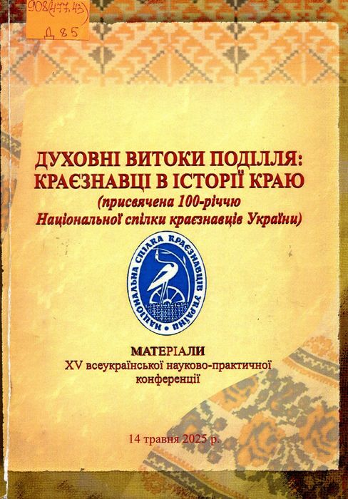 А22131-15(2025) 908(477.43) Д85 Духовні витоки Поділля : краєзнавці в історії краю : матеріали XV Всеукр. науково-практ. конф. м. Хмельницький, 14 трав. 2025 р. (присвяч. 100-річчю Нац. спілки краєзнавців України) / М-во освіти і науки України, Хмельниц. обл. орг. Нац. спілки краєзнавців України, Хмельниц. гуманіт.-пед. акад. ; редкол.: І. М. Шоробура, О. М. Галус, В. Р. Адамський та ін. – Хмельницький : ХГПА, 2025. – 375 с. – Бібліогр. в кінці ст. У виданні вміщені наукові статті, в яких висвітлений краєзнавчий рух на Хмельниччині, описана творча та громадська активність відомих постатей краю, діяльність краєзнавчих організацій.