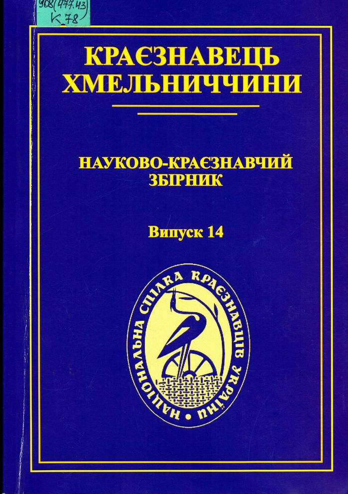 УДК 908(477.43) К78 Краєзнавець Хмельниччини науково - краєзн. зб. Вип. 14 / Нац. спілка краєзнавців України, Хмельниц. обл. орг. НСКУ ; гол. редкол. Ю. В. Телячий ; відп. ред.: В. С. Прокопчук, В. Р. Адамський та ін. - Хмельницький : ХОО НСКУ, 2022. - 224 с. Збірник містить офіційні матеріали про діяльність Хмельницької обласної організації НСКУ за 2021 – 2022 рр., хроніку про розвиток краєзнавчого руху на Хмельниччині, інформацію про роботу місцевих осередків НСКУ, наукові дослідження з історії, археології та постатей краю, рецензій, огляди, бібліографію новітніх науково – краєзнавчих видань, цікаві факти, привітання з ювілеєм відомих поділлєзнавців тощо.