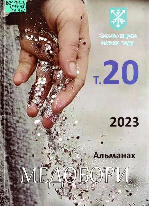 П994-20(2023) 821.161.2(477.43) М42 Медобори: альм. № 20 2023 / Хмельниц. обл. осередок Всеукр. творчої спілки «Конгрес літераторів України», Хмельниц. міська літ. спілка «Поділля»; ред.-упоряд. В. А. Захар’єв. – Вінниця: Меркьюрі-Поділля, 2023. – 306 с.: портр., фот. – ISBN 978-617-7230-37-8. Ювілейний літературно-мистецький альманах відкриває розділ про російсько-українську війну. Також у виданні вміщено творчий доробок членів Хмельницького обласного осередку ВТС «Конгрес літераторів України» та поетів і прозаїків, які не входять до цього осередку, а є представниками інших літературних формацій. Видання реалізовано відповідно до «Програми підтримки книговидання та читацької культури у м. Хмельницький на 2021-2025 роки «#ЩодняЧитай українською».