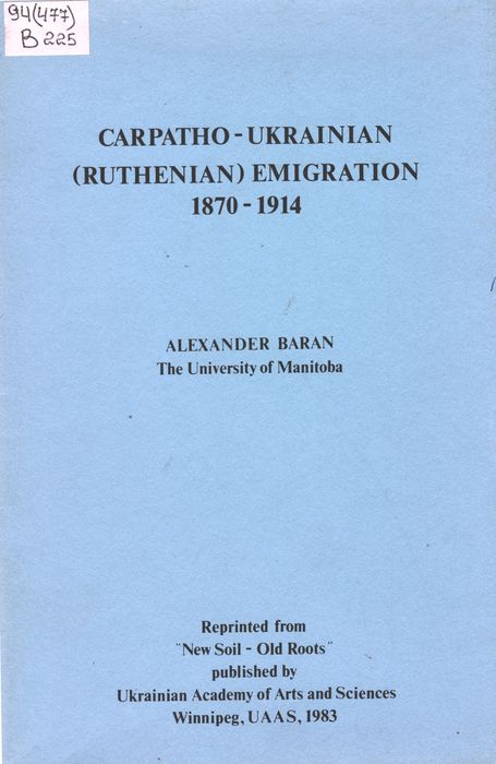Baran A. Carpatho-Ukrainian (Ruthenian) Emigration: 1870-1914, Winnipeg: Ukrainian Academy of Arts and Sciences, 1983. – 26 p.