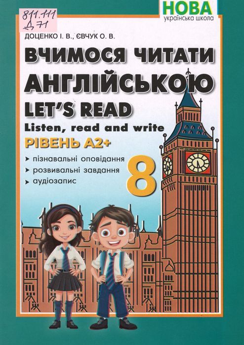 811.111 Д71 Доценко, І. В. Вчимося читати англійською. Let’s read. Listen, read and write. 8 клас / І. В. Доценко, О. В. Євчук. – Кам’янець-Подільський : Сисин О. В. –Абетка, 2025. – 81 с. – (Нова українська школа). Посібник призначений для вивчення англійської мови учнями сьомого року навчання. Книга містить тематичний та граматичний матеріал, завдання для розвитку аудіювання, читання, письма і говоріння на рівні А2+. Даний посібник укладено відповідно до типових освітніх програм для 8 класів закладів загальної середньої освіти.