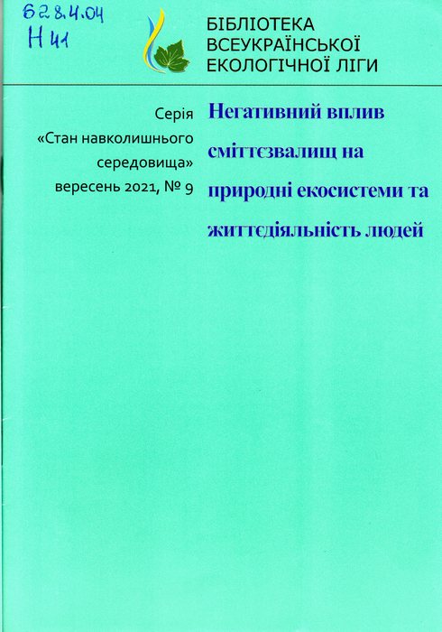 А42463–9(2021) 628.4.04 Н 41 Негативний вплив сміттєзвалищ на природні екосистеми та життєдіяльність людей: поради / Всеукр. екол. ліга ; гол. ред. Т. В. Тимочко. – Київ: Центр екол. освіти та інформації, 2021. – 28 с.: іл. – (Бібліотека Всеукраїнської екологічної ліги) (Стан навколишнього середовища; вересень, 2021, № 9).