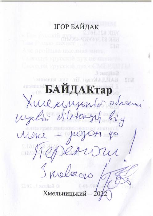 «БАЙДАКтар» – перша друкована книжка, присвячена повномасштабній війні в Україні. Кожен вірш – це реакція на певні події. Книжка кишенькового формату, розрахована як подарунок нашим захисникам для підтримання бойового духу, тепер доступна і для користувачів бібліотеки.