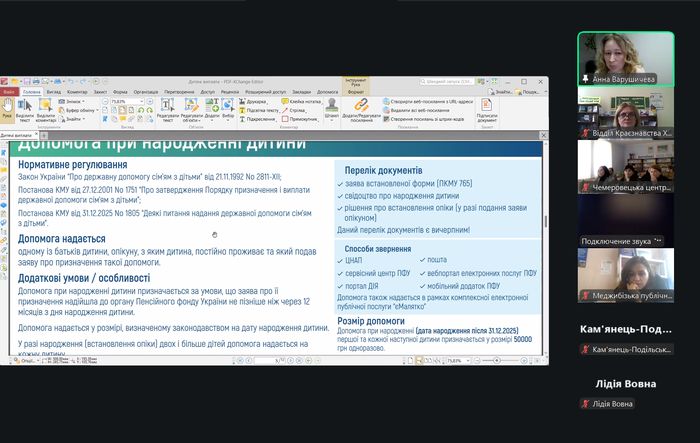 Анна Станіславівна проінформувала учасників про Закон України № 4681-IX «Про внесення змін до деяких законів України щодо підтримки сімей з дітьми та створення умов, які сприяють поєднанню материнства (батьківства) з професійною діяльністю» від 5 листопада 2025 року та Постанову Кабінету Міністрів України від 31 грудня 2025 р. № 1805 «Деякі питання надання державної допомоги сім’ям з дітьми», які вступили в дію з 1 січня 2026 року і наголосила, що новий закон передбачає як підвищення вже існуючих виплат, так і запровадження абсолютно нових видів державної допомоги та охоплює весь період — від вагітності майбутньої мами і до моменту, коли дитина йде до школи.