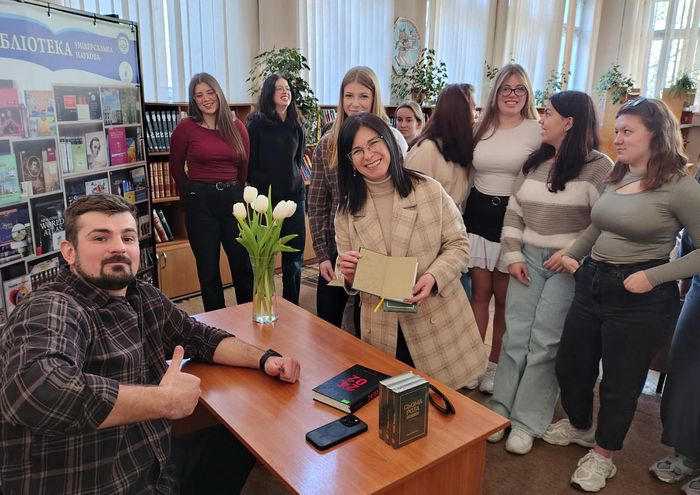 Під час зустрічі автор поділився історією своєї ініціативи: від початку повномасштабного вторгнення його книжки не продаються у традиційному форматі, а обмінюються на благодійні донати. Такий підхід перетворив літературу на інструмент підтримки українського війська. За два роки завдяки цьому вдалося зібрати три мільйони гривень на допомогу Збройним Силам України.