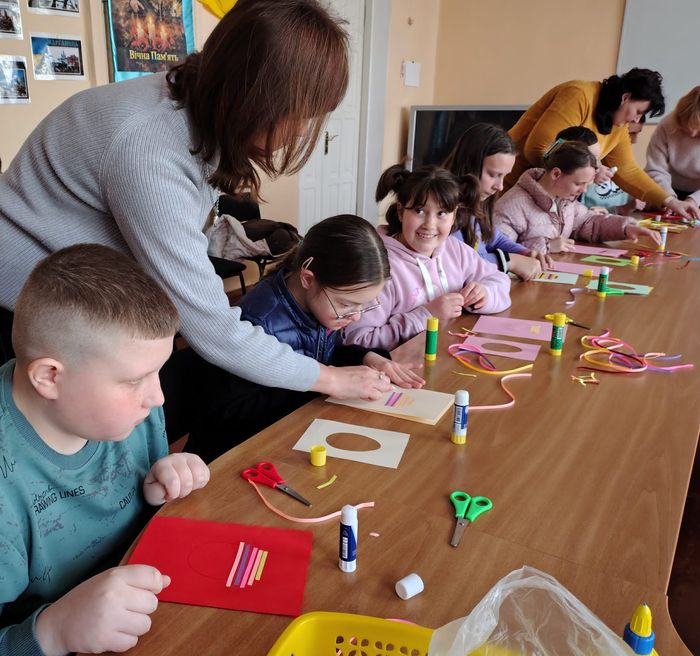Практична частина заходу стала справжнім простором для творчості: учні власноруч виготовляли святкові листівки в техніці аплікації. Використовуючи кольоровий папір, клей і декоративні матеріали, вони створили яскраві вироби, прикрашені оригінальними елементами.
